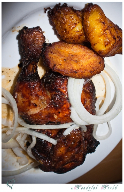 .jpg) The Pollo al Ajillo – Garlic Chicken was basically rotisserie chicken.  While it was tender, I couldn’t taste much of garlic seasoning.  The mojo sauce was the same as the one severed with Yuca Frita, just too tart.  I think you can buy the rotisserie chicken from Costco and squeeze lemon juice on it and make your own.  I thought maybe if the onions were caramelize, they might add some extra flavor to the meat.  Every entree comes with Rice, Beans and Fried Plantains.  I am not big on Fried Plantains, and these didn’t really make much of an impression, either.
