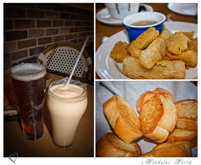 Right after we ordered the drinks, a basket of complimentary garlic bread (below – lower right) was brought over.  Who doesn’t like garlic bread?  🙂  My Mango Shake  (below – left)  was thick and not overly sweet which was how I like it.  The Yuca Frita (below – upper right) tasted kind of like fried tater tots.  The accompanying Mojo Sauce was very tart.  I tasted mostly lemon juice which I found too overpowering.