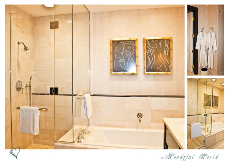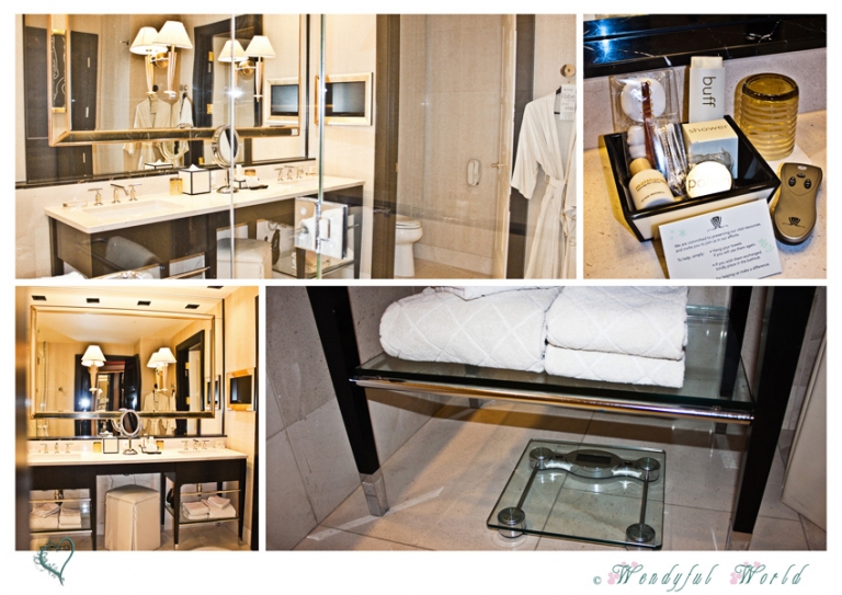 The marble bathroom is well equipped with a 19 inch flat screen TV, dual sink, resort ropes and slippers, and even a scale. Why would anyone want to weight themselves on vacation is beyond me.