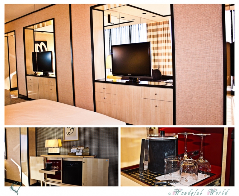 I love whoever thought of designing the cove dividing the bedroom and living room. You can just turn the Flat Screen TV and watch it from either side. Pure genius! The little bar is also very cute! All the curtains and lights are controlled by touch controls on the night stand. Very high tech.