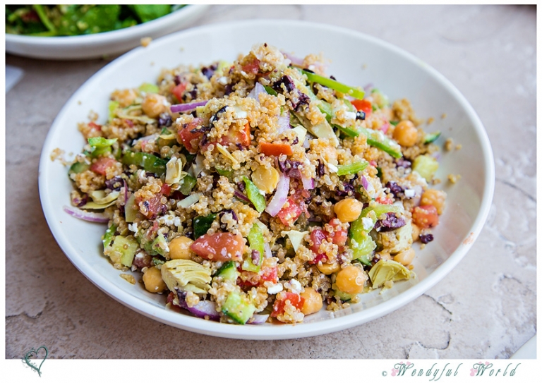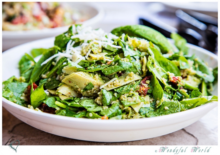 The Healthy Hybrid (Quinoa, garbanzo beans, Kalamata olives, green bell peppers, red onion, cucumber, tomato and artichoke hearts – tossed with Dijon Mustard Vinaigrette and topped with Feta cheese) is packed with flavors.  It is beautiful to your eyes as it is to your palate.