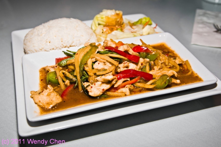 Basil (Ga-Pow) with Chicken (Sautéed with minced garlic, fresh chili, basil leaves, bell peppers & bamboo shoots)