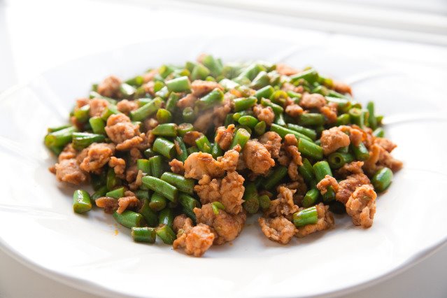 The green bean dish is copied from a Thai dish called Prik Khing. I just cut the green beans to smaller pieces to match the ground chicken. Sate with red curry paste.