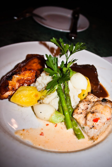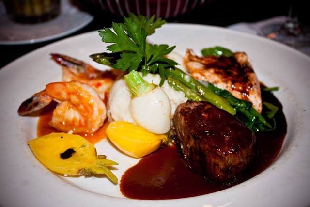 Second course for my meal was Choose Three Selections to Build your Trio Entrée Plate Accompanied by The Chef’s Pick of Farmer’s Market Vegetables and Mashed Potatoes or Rice Pilaf. I picked Filet Beef with Roasted Shallot Demi Glace, Natural Atlantic Salmon with Shallot Balsamic Reduction and Sautéed Spinach, and Jumbo Thai Shrimp Sweet Peanut Chile Dressing. The beef was excellent. It was tender and flavorful. We asked for medium and it was cooked perfectly. The salmon was just OK. I thought the sauce was a little too strong. The shrimp was the weakest. I thought it was made with Shrimp Cocktail and thrown together with the sauce. Absolutely no thought into it. It tasted cold and blend despite the sauce. The mash potato was overly seasoned. It was too salty and with a funny taste.