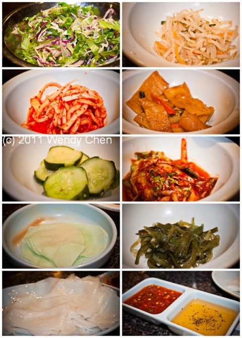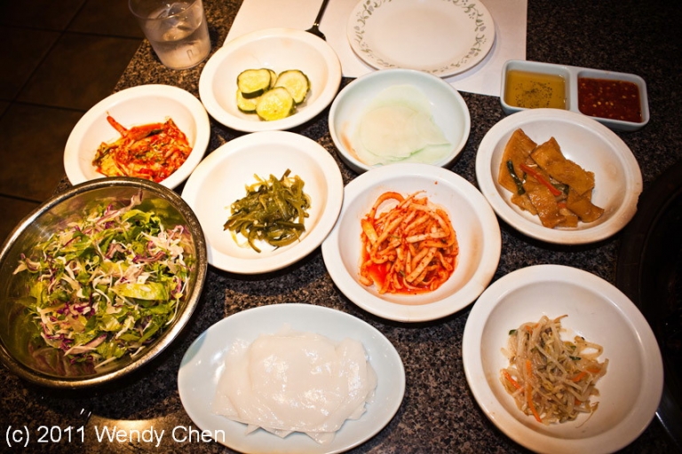The little side dishes (Banchan) can make or break a K-BBQ meal. At Shik Do Rak, you get an average of 9 sides. They change them up, but some of the staples are Chopped Salad, Bean Sprout, Spicy Shredded Turnip, Seasoned Fish Cake, Picked Cucumber, Kimchi, Sliced Daikon (to wrap meat with), Seaweed, and Rice Wrapper (to wrap meat with). They also give you a chili sauce and salt/sesame oil mixture to dip your meat. I LOVE the salt/sesame oil sauce. It’s so addicting!
