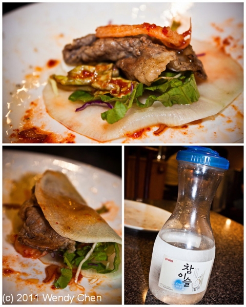 Or Daikon Wrapper, kind of like a little taco. Dip it in the dipping sauce, and you’ll have a little piece of heavenly tasty yumminess! Make sure to drink lots of water to wash down the salt.