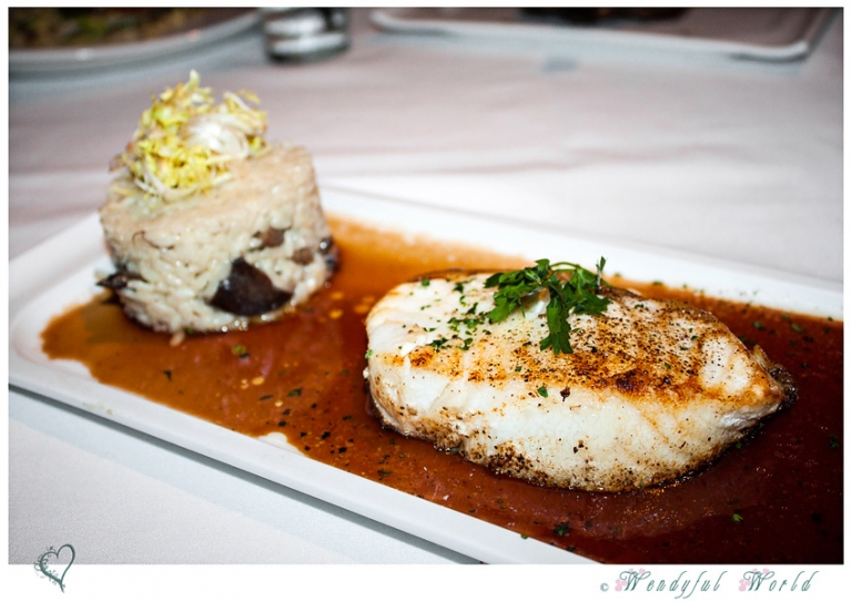 In an effort to eat healthier, I decided on Baked Chilean Sea Bass (Exotic Mushroom Risotto, Asparagus, Truffle Essence, Concord Grape Demi-Glace Reduction). I’ve had excellent Sea Bass before and was really eager to try it here. The presentation was beautiful. However one bite into it, I was a little disappointed. It was over-cooked so the fish was dry and stringy, not at all tender like I expected. It did have a few spots where it was tender but 80% of it was not. Despite the nice sauce and Mushroom Risotto it was accompanied, it was a let down. My other guest ordered the same dish and his was over-cooked as well.
