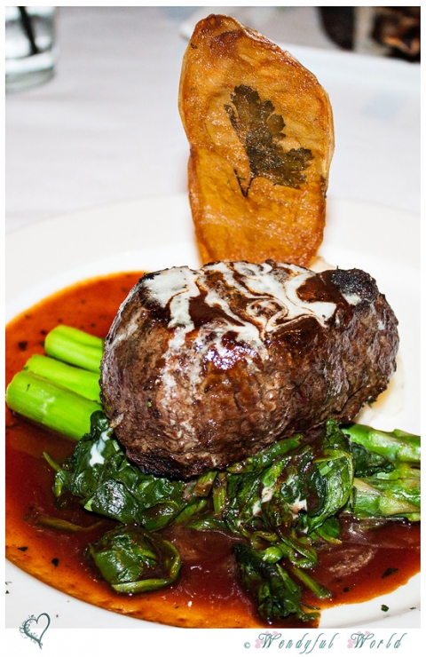 Allen’s entree was highly recommended by our server – 10 oz Bone in Prime Filet Mignon. This was probably the best dish of the night. Allen had asked for medium but it came medium rare. In my book, not cooking the meat according to order is a big No-No in a fine dining restaurant. I would have sent it back, but Allen didn’t. Nevertheless, the filet was very tender and the sauce, vegetables, and mash potato all went well together.