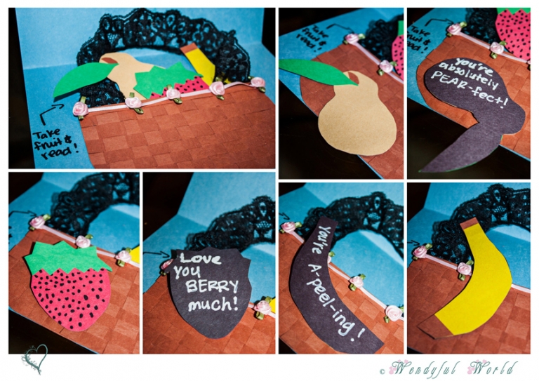 My daughter is amazingly creative and always makes hand-made one-of-a-kind greeting cards for everyone. Each one and each year is different. This year, she made ma a fruit basket. Each piece of the card is hand made and cut out by hand. And she makes up clever phrases for each theme! I love it!