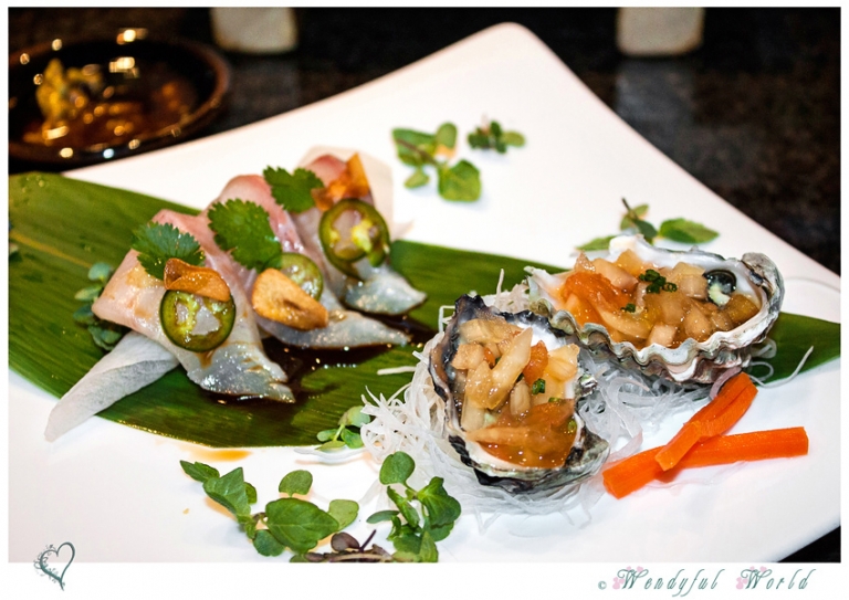 Our dining excursion began with Kumato Oyster and Garlic Hamachi (Jalapeno, Fried Garlic, ponzu sauce). I had to ponder twice before eating the oyster as I’ve NEVER had raw oyster before. To my surprise, it was not as ‘scary’ as I thought it might be. I tasted the oyster but with the onion and sauce, it didn’t taste ‘raw’ to me and was actually very good! The Garlic Hamachi was sweet with a bit of heat from the jalapeno and was just lovely.