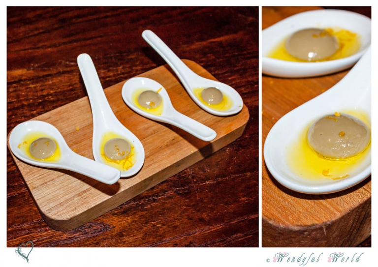 ‘Do you like Olives?’ Mario asked. ‘Not really because they are usually too salty for me.’ I said. Minutes later, Mario brought over Ferrán Adrià’ (liquid olives). The technique relies on a simple gelling reaction between calcium chloride and sodium alginate. These little delights melt in your mouth.