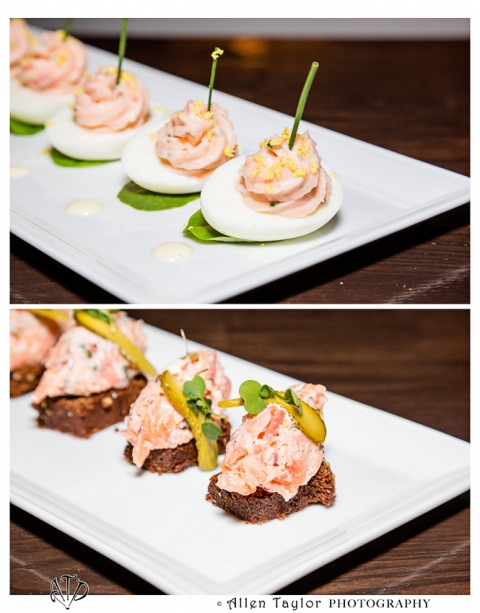Smoked Salmon Deviled Eggs with wild watercress and lemon oil (below top) has a delicate mousse-like texture with the egg white perfectly cooked. Salmon Rillettes served on house-made Guinness bread with red onion (below bottom), watercress, and lemon aioli.
