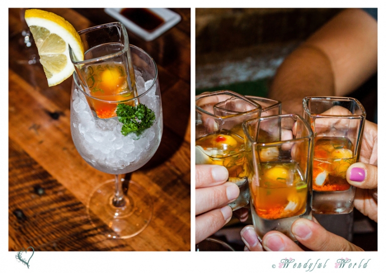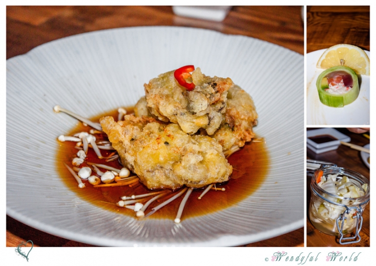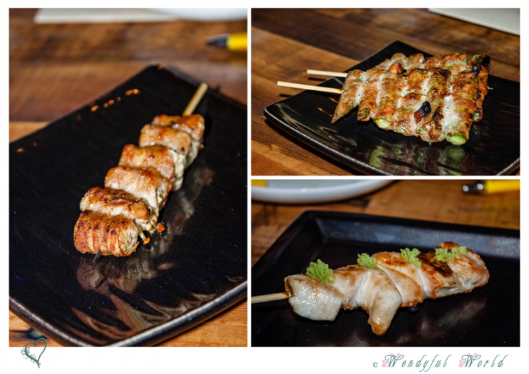 Pictured top left plate is a sample tasting plate.  The other images were of the actual serving sizes.  These would be perfect starters to share.  In Japan, Izakaya (pub) is where people often go after work with friends and co-workers for some light bites and drinks, very much like the Happy Hour in the US.  Next we were served these cute little Oyster Shooter with Quail Egg.   Have you ever seen a more adorable presentation than this?  The sauce tasted much like Yuzu sauce which really complimented the oyster and quail egg well. The 3 Yakitoris  (pictured above clockwise left to right) were Enoki Mushroom Maki, Asparagus Maki and Chicken Breast.  The first 2 were wrapped in Japanese Pork Belly slices which were much healthier than bacon.  The Oyster Tempura (above left) – enoki mushroom + grated radish + ponzu sauce was a crowd pleaser.  We also got to sample Pink Lay Roll (above upper right) – crabmeat + avocdo + cucumber + tuna, Love Roll (forgot to take pic) – salmon + tuna + yellowtail + albacore + avocado + cucumber + soy paper, and homemade Oshinko – Japanese pickled carrots + radish + cucumber + cabbage.