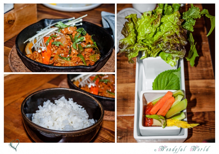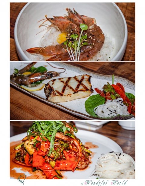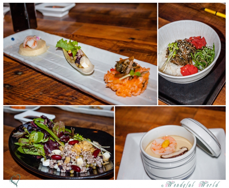 I love the abstract design of the interior with roll down screen TV and flat screen TVs on the wall.  The restaurant looks ultra modern and hip.  I knew the restaurant was Korean operated, so I was curious about how Korean food would play into the menu.  And I was pleasantly surprised at how innovative many of the dishes were.  Our first sample plate consisted of Jawanmushi– Japanese steamed egg custard + shrimp + ginko nuts + shitake mushroom, Whole Grain Salad – Black rice + Indian millet + lentil + kidney beans + fresh mozzarella + baby mesclun + soy vinaigrette and Siraegi (Dried Radish Greens) Rice Bowl – Slow cooked with special soy dash + baby anchovy, over rice and topped with masago + radish sprouts.