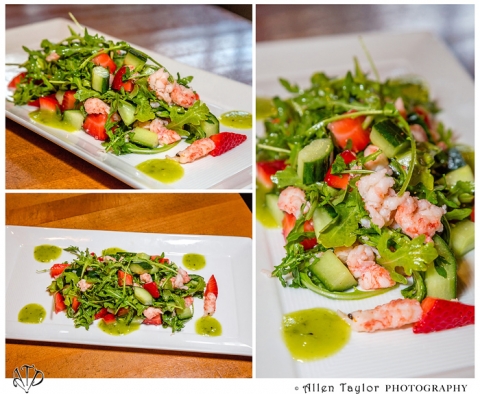 LANGOSTINO STRAWBERRY SALAD (Langostino, strawberries, cucumber and avocado over arugula; tossed in citrus vinaigrette and served with kiwi wasabi sauce and truffle salt) – The langostino looks like shrimp but tastes firmer like lobster. It’s a beautiful dish that makes a great appetizer salad to share.