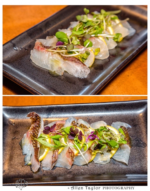 RED SEABREAM CARPACCIO (Sliced Red Seabream and lemon topped with spicy yuzu dressing, organic micro greens, truffle salt and lemon zest) – Pure and simple dressing really allows the flavor of the fish to come through. If you prefer a little zest, eat it with the lemon slices.